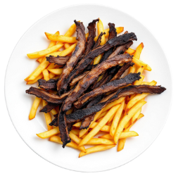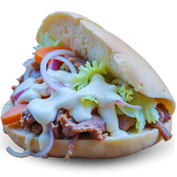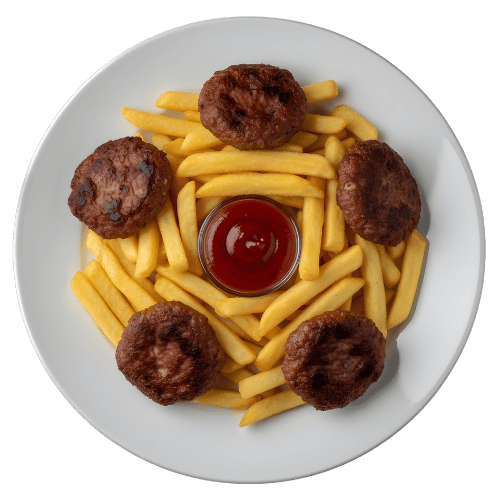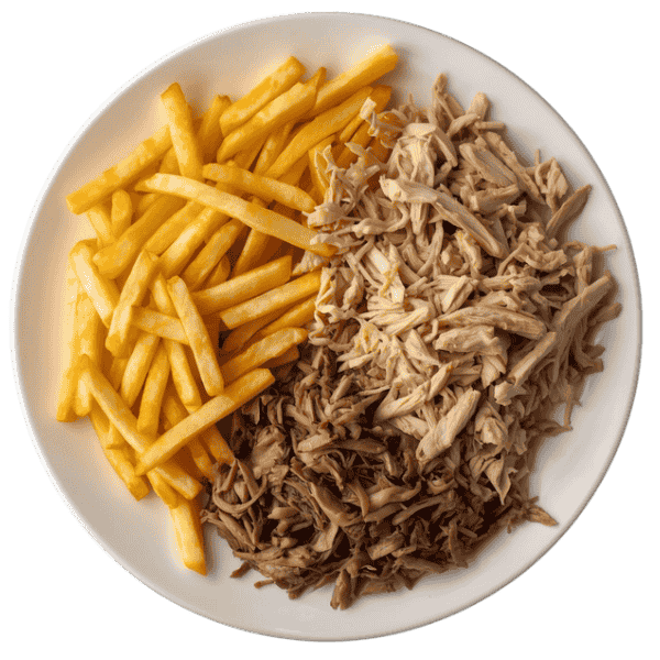 kip, kebabvlees met frieten of rijst, groenten, mozzarella en tomatensaus